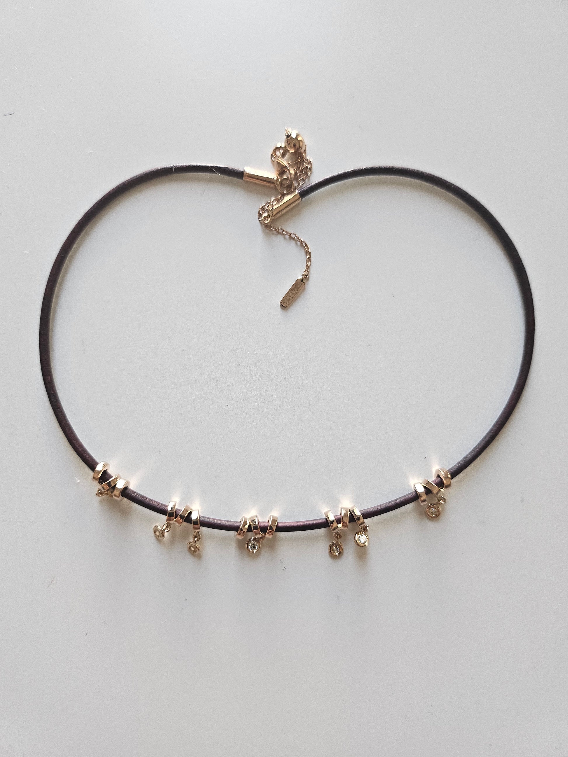 5 sets of triple loop dangling spot diamonds on a thin leather choker. Dia =.17cts / Gold = 5.21 grams.