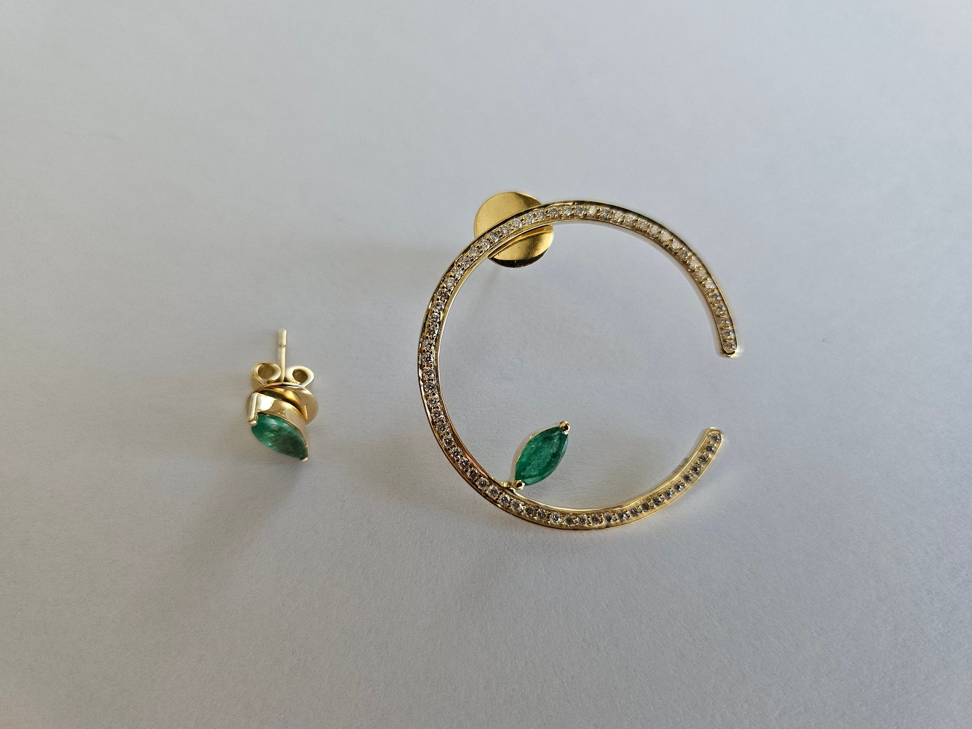 One stud marquise emerald and the other side a C shaped earring with an emerald marquise on the side of the earring. Dia .345 cts / Emerald .4 cts / Gold 5.84 grams.