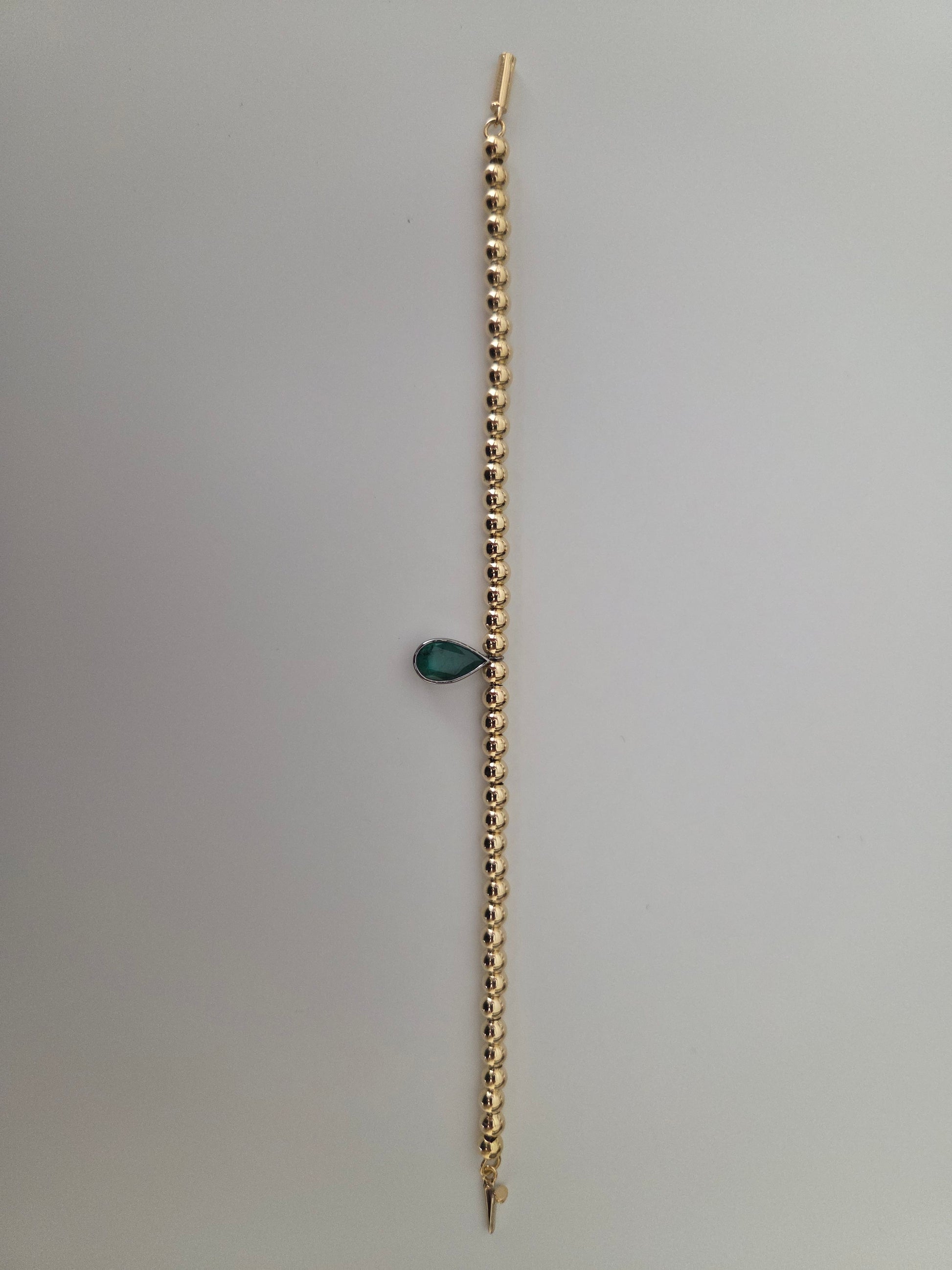 A pear emerald on bezel setting dangling from a gold ball bracelet. Emerald 1.33 cts / Gold 5.195 grams.