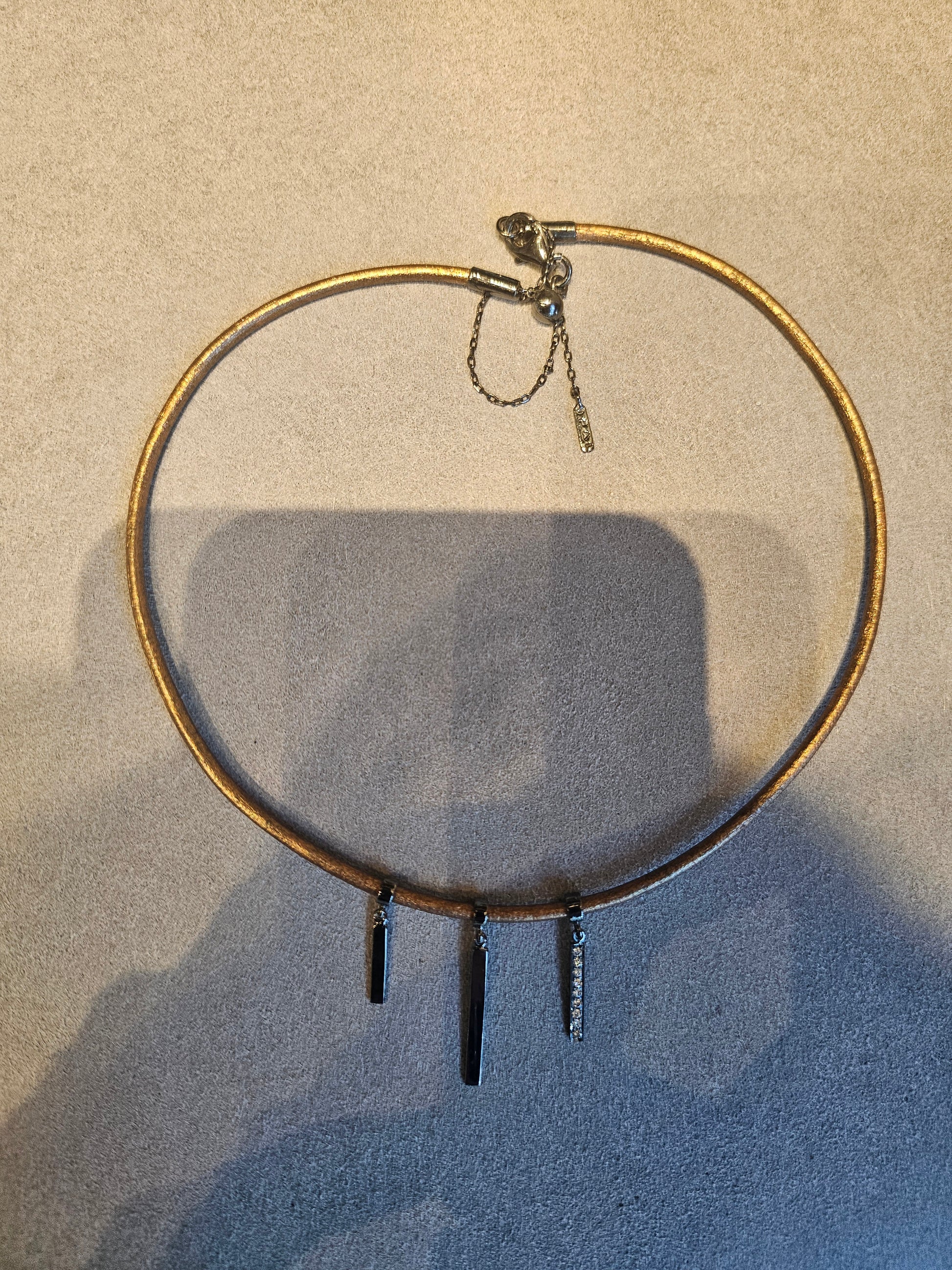 A triple line dangling from a leather choker with one line full diamonds. Diamonds .06 cts. Gold 2.93 grams.
